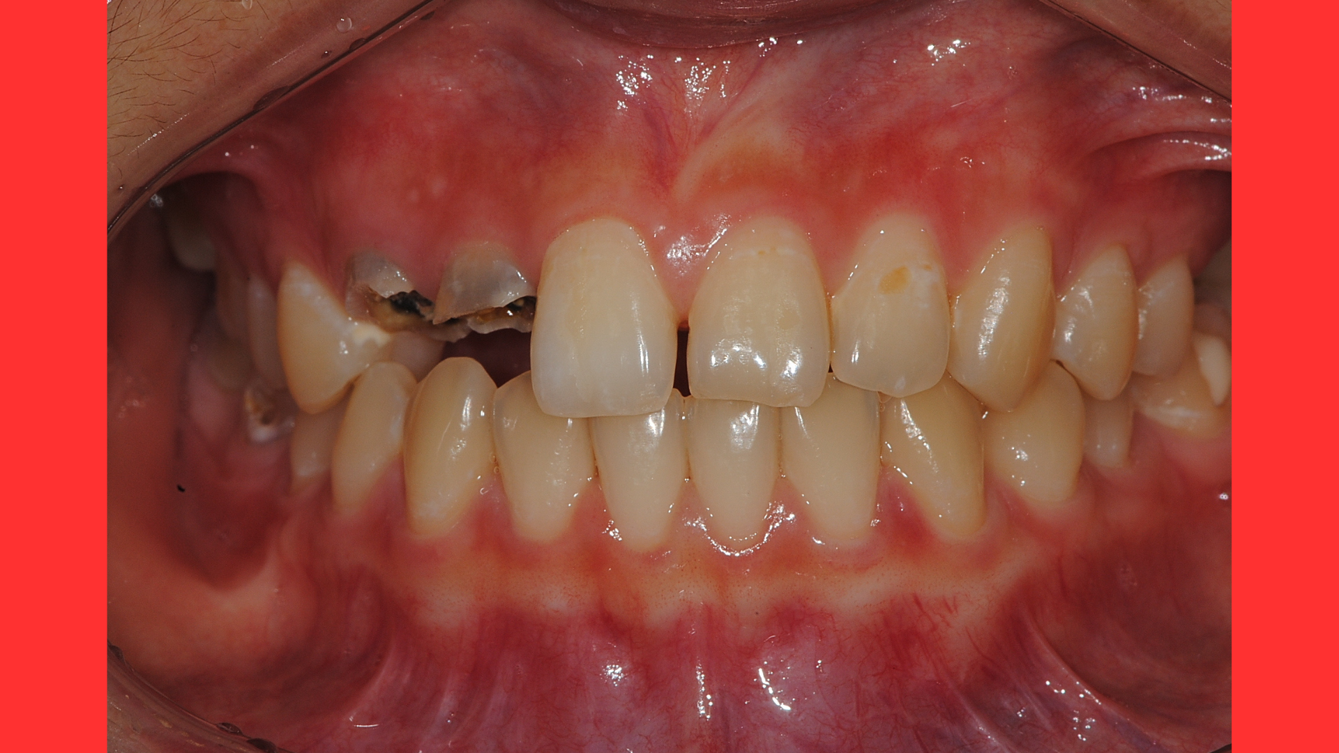 두번째 보이는 부분을 보시면 우리가 볼때 왼쪽과 오른쪽의 충치가 있는 치아의 잇몸높이가 다릅니다.